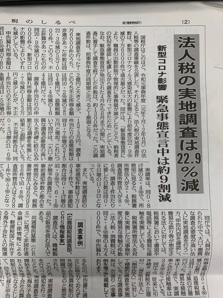 コロナ禍における法人税の実地調査大きく減少(税のしるべ)